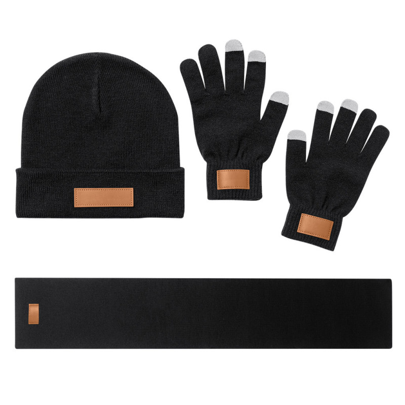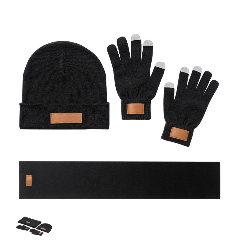 Conjunto de 3 peças: gorro, cachecol e luvas tácteis, ideais para oferecer conforto e funcionalidade em dias frios. Cada peça inclui uma etiqueta cosida em PU castanho, ideal para personalização. Apresentado em elegante caixa preta.