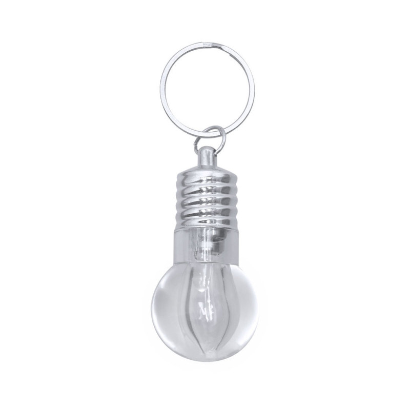 Lanterna de porta-chaves com design original em forma de lâmpada. Com 1 LED alimentado por pilhas de botão (incluídas), com botão de ligar/desligar na lateral, elementos decorativos e anel cromado.