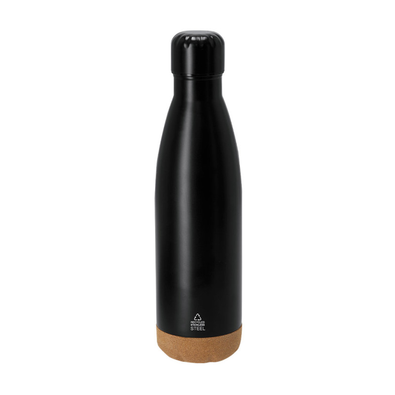 Conjunto de blocos de notas, caneta e garrafa térmica. Inclui: - bloco de notas de capa rígida, feito de cortiça e poliéster RPET 300D, marcador de tecido e elástico de fecho a condizer. 80 lençóis interiores forrados. - Caneta com cortiça e corpo revestido a alumínio. Clip e acessórios elegantes a condizer, com mecanismo de botão e tinta azul. - Tambor térmico de aço inoxidável reciclado com capacidade de 500ml, com base em cortiça. Tampa de rosca. Com o distintivo logótipo da Recycled Stainless Steel.