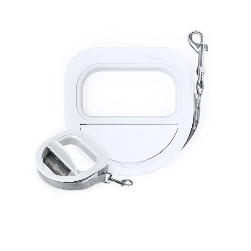 Trela de 3 metros, confeccionada em poliéster resistente, com carcaça robusta em ABS. Pega ergonômica confortável e prático compartimento com tampa para guardar os sacos. Inclui mosquetão de metal com fixação giratória e vem apresentado individualmente numa caixa de design kraft.