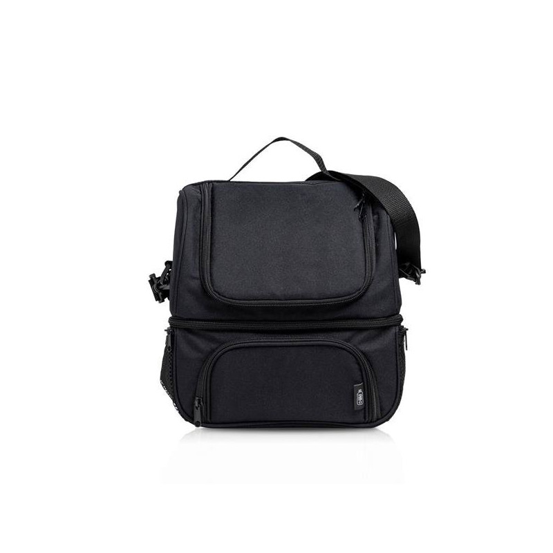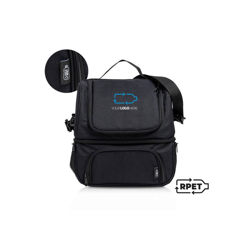 Esta Bolsa térmica, produzida a partir de garrafas usadas, tem dois compartimentos separados para que possa transportar alimentos quentes e frios separadamente. Inclui uma alça de ombro ajustável para mais fácil transporte. O seu interior é em PEVA facilmente lavável com 2 mm de isolamento.