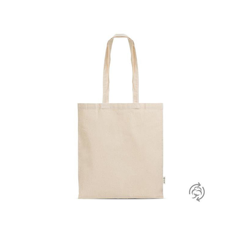 Saco de compras em algodão reciclado 180g/m² de asas compridas, composto por 70% algodão reciclado e 30% RPET (plástico reciclado), com dimensões de 38×42cm. Este saco combina durabilidade, leveza e consciência ambiental, oferecendo uma solução prática para o dia a dia. As alças compridas proporcionam conforto no transporte ao ombro, tornando-o ideal para levar consigo em compras, eventos, trabalho ou atividades do quotidiano. Ao incorporar fibras recicladas na sua composição, este saco contribui para a redução de resíduos e para a valorização de materiais já existentes, alinhando a sua marca com práticas mais sustentáveis Uma escolha que reflete cuidado com o planeta, sem comprometer a qualidade ou o estilo. Promova a sua marca com um produto que comunica sustentabilidade de forma simples, eficaz e contemporânea.