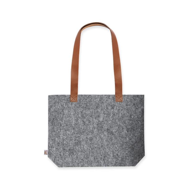 Saco da linha nature fabricado em feltro RPET, com asas compridas reforçadas (70 x 3 cm) em polipel de tom castanho. De acabamento cosido e com fole na base, com corpo disponível na cor cinza e natural. Etiqueta exterior com distintivo RPET. Resistência até 6 kg de peso.O feltro RPET é fruto da combinação do processo de reciclagem de materiais plásticos junto com a técnica milenar de fabrico do feltro, dando como resultado um material de eco-tendência que, para além de ser de origem reciclado, también se converte en reciclável.