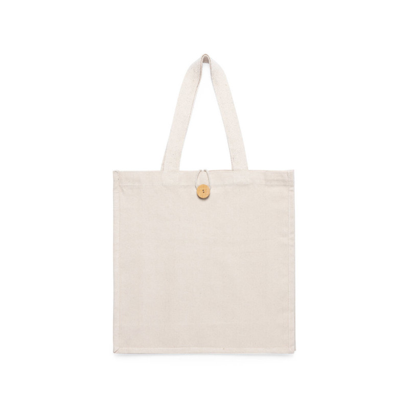 Saco fabricado em algodão, de acabamento natural e em gramagem extra de 310g/m2. Com original fecho de botão, acabamento cosido e com fole. Asas médias extra largas e reforçadas (60 x 3,5 cm). Resistência até 10 kg de peso.