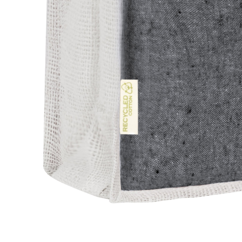 Saco em material algodão reciclado de 140 g/m2 em combinação com juta. Asas longas de 60 cm com reforço, de acabamento cosido e fole de juta. Distintivo na etiqueta lateral e resistência até 8 kg de peso. Disponível numa variada gama de cores nature com base de cor natural.
