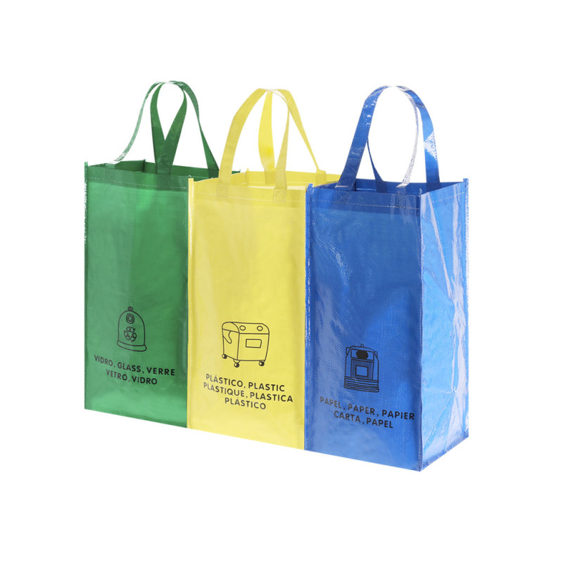 Conjunto de 3 sacos de reciclagem azul-verde-amarelo em pp laminado resistente no final de 125g/m2. Incluindo 3 sacos 23x45x23cm unidos por tiras de velcro laterais resistentes. Com alças reforçadas e indicação de tipos de resíduos: plástico e embalagem, vidro e papel.