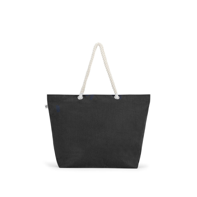 Saco de praia em algodão reciclado (70%) e poliéster reciclado (30%) (220 g/m²). As alças, com 65 cm, são em corda de algodão estilo torcido, conferindo um toque confortável e que evoca o espírito náutico. O algodão reciclado é de cor sólida não tingido. A matéria-prima é usada na sua forma e cor originais, sem o uso de produtos químicos de tingimento ou branqueamento, contribuindo para um menor impacto. A cor sólida é obtida pela escolha de fio reciclado com a mesma tonalidade, podendo aparecer impurezas e variações de cor. 550 x 390 x 150 mm