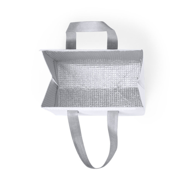 Saco refrigerador em não-tecido laminado. Compartimento principal com fecho em velcro e interior em alumínio isotérmico. Acabamento termos-selado, com foles e asas reforçadas. Disponível numa vasta gama de cores.