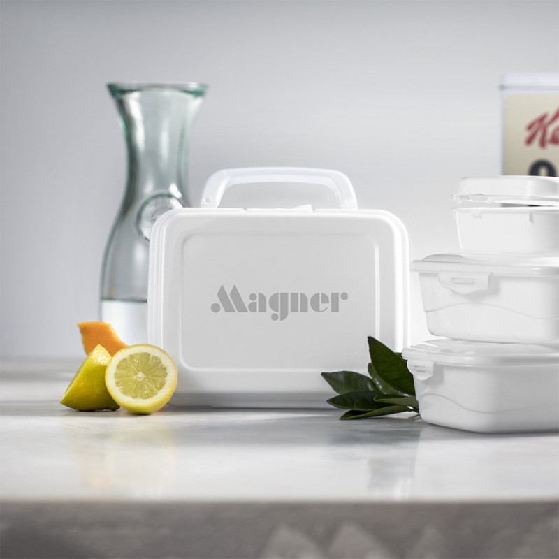 Lancheira de 1L de capacidade, feita em PP branco. De fabricação europeia com certificação Food Grade, garantindo a segurança no contato do alimento com o material utilizado na fabricação do produto. Formato quadrado, com alça de transporte prática e fecho de segurança.