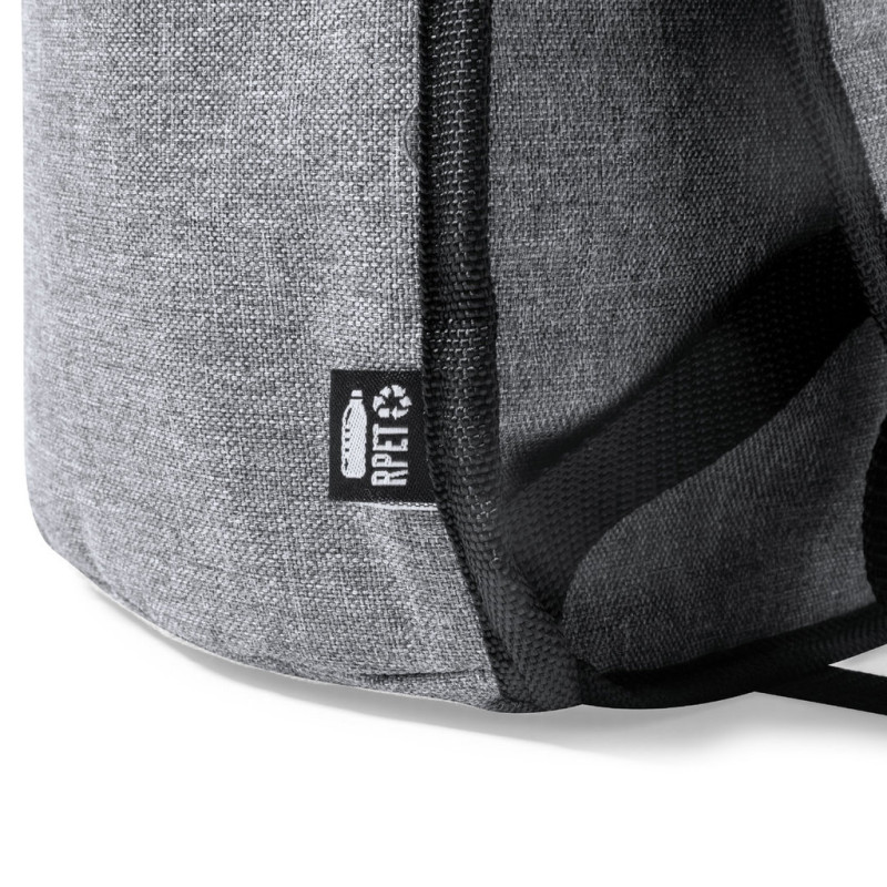 Mochila refrigeradora fabricada em resistente 600D RPET. Acabamento em cor cinza, com asa de transporte. Alças para ombros acolchadas e ajustáveis. Compartimento principal com fecho de correr e puxadores metálicos. Interior isotérmico em alumínio e etiqueta exterior com distintivo RPET.O material RPET elabora-se a partir de plástico reciclado, para assim fomentar a reutilização de resíduos plásticos e ajudar a sustentabilidade do planeta.