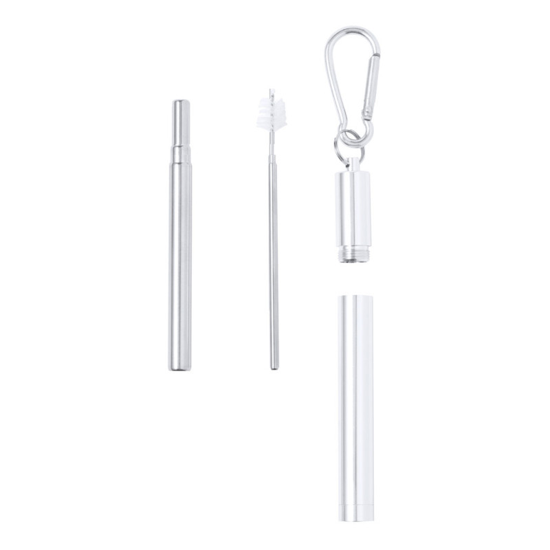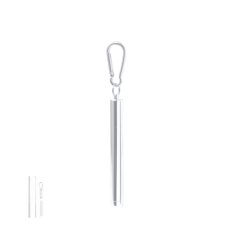 Palhinha reutilizável de aço inoxidável e extensível com bocal de silicone. Com acessório limpador incluído e apresentado num estojo correspondente com mosquetão para transporte.