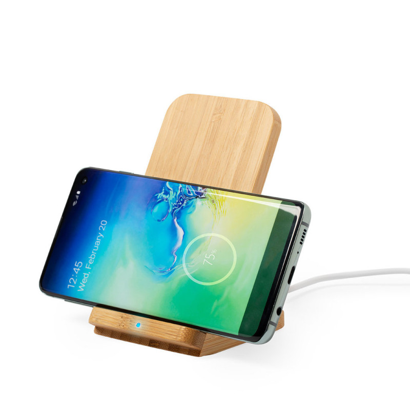 Linha da natureza, carregador sem fio com funcionalidade do titular do smartphone. Feito de bambu, a partir de pedaços de bambu de corte natural. Indicador de carregamento e compatível com dispositivos equipados com tecnologia de carregamento sem fio. Área de impressão ampla e apresentada em uma caixa atraente, individual e ecológica.