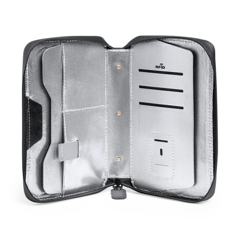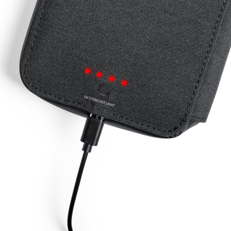 Organizador e esterilizador de luz ultravioleta tipo C, com proteção RFID (Identificação por Rádio Frequência) que mantém seguros os seus dispositivos de transmissão de identidade. Especialmente desenhado para a eliminação de microrganismos e bactérias em smartphones e outros objetos de uso quodidiano. Fabricada em resistente poliéster 600D de acabamento denim, com fecho magnético de segurança em puxador para um uso seguro do dispositivo. Inclui 4 porta-cartões interiores + bolso exterior. Apresentado em atrativa caixa individual de design.Potência LED 1.2W e longitude de onda 275nm.Tempo de esterilização com função auto-apagado de 1 e 3 minutos.Disponível manual de utilizador em espanhol e inglês.Disponível certificação CE, RoHS e de efetividade germicida.Para um uso adequado do produto, evitar o contato com a pele e os olhos.