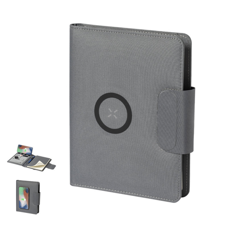 Pasta/Bloco multifunções em poliéster 300D RPET, feito a partir de plástico reciclado, para assim promover a reutilização de resíduos plásticos e ajudar a sustentabilidade do planeta. Com fecho magnético e etiqueta interior com distintivo RPET. Inclui carregador sem fios de 10W integrado na capa, com fixação magnética para poder utilizar o dispositivo enquanto carrega e inclui anel adesivo, válido para todos os dispositivos com tecnologia Magsafe e Qi.Bateria incorporada de 5.000 mAh de capacidade, com porta Tipo C de entrada/saída e indicadores LED de estado de carga, com cabo incluído.Interior com suporte para smartphone e uma multiplicidade de compartimentos para cartões, incluindo suporte para caneta e bloco A5 com 65 folhas pautadas. Apresentado numa atrativa caixa de design individual.As capacidades apresentadas em todos os nossos powerbanks são reais, todas incorporando baterias de grau A e não recicladas, com uma vida útil de pelo menos 500 ciclos de carga e aprovadas pela CE. Além disso, são fabricados segundo as normas RoHS e em conformidade com os seguintes requisitos de segurança: Sistema de proteção de sobrecarga do powerbank. Sistema de proteção total contra descarga completa que proporciona uma maior durabilidade do powerbank. Sistema de bloqueio para evitar curto-circuitos. Sistema de transferência de carga constante, de acordo com a capacidade do dispositivo alvo.