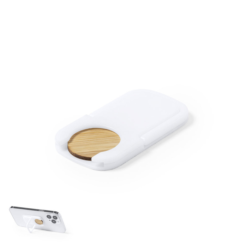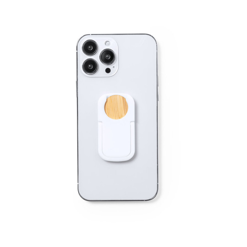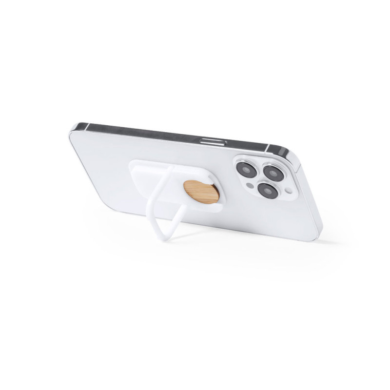 Suporte multifunções para smartphone, com moeda para carrinho de compras integrada e anel/suporte dobrável. Corpo fabricado em resistente ABS de acabamento branco, com moeda em bambu. Com adesivo de fixação extra forte e livre de resíduos ao descolá-lo do dispositivo.