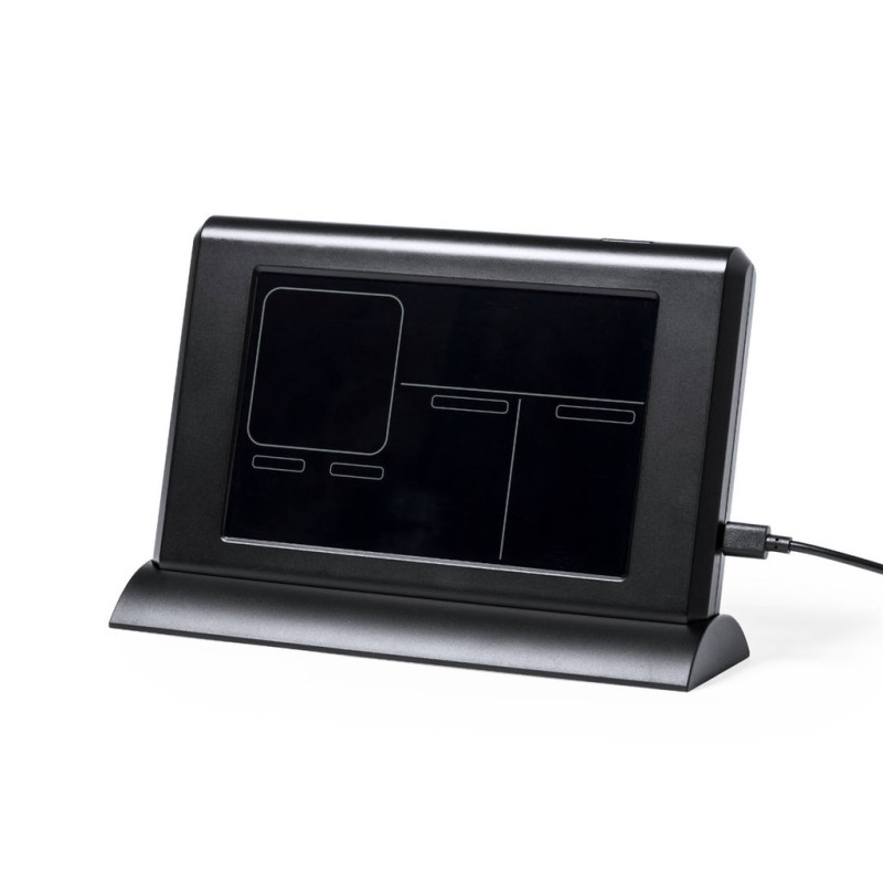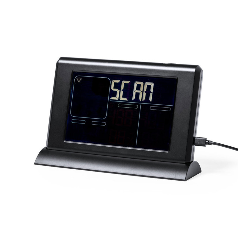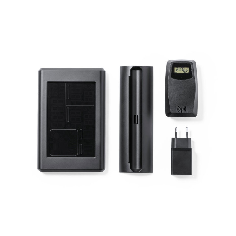 Estação meteorológica premium multifunções, fabricada em resistente ABS de acabamento preto acetinado. Inclui ecrã retro-iluminado, de fácil leitura e com gráficos de cor. Com sensor sem fios para temperatura/humidade exterior e sensor integrado para temperatura/humidade interior. Funções alarme e calendário, com APP disponível -compatível com iOS/ Android- para controlo remoto através da rede WiFi e funções extra. Adaptador de corrente e cabo USB incluído de 1 m de comprimento, com suporte para montagem na parede. Sensor externo com alimentação a pilhas (2xAAA não incluídas). Apresentação em caixa individual de design kraft, com manual de instruções em espanhol e inglês.