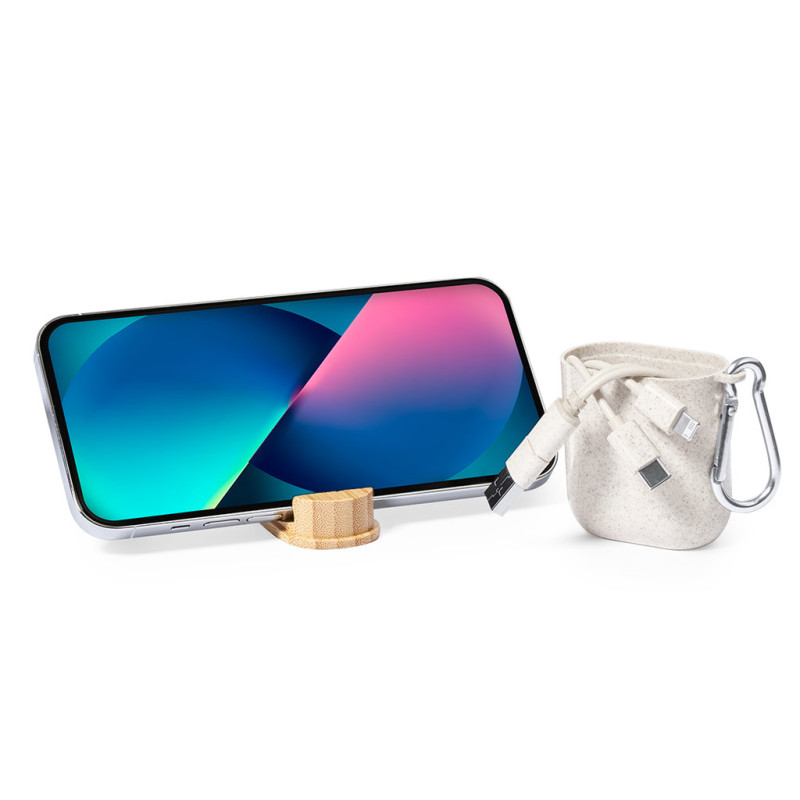 Cabo carregador fabricado em fibra de trigo. Com conexões de entrada Tipo C e USB e saídas Tipo C, Lightning e Micro USB. 5V DC 2.4A. Apresentado em elegante estojo de design fabricado em fibra de trigo e tampa de fecho en bambu, com função suporte para smartphones. Elaborado com elementos vegetais para assim fomentar a utilização de matérias-primas naturais e reduzir as emissões poluentes.