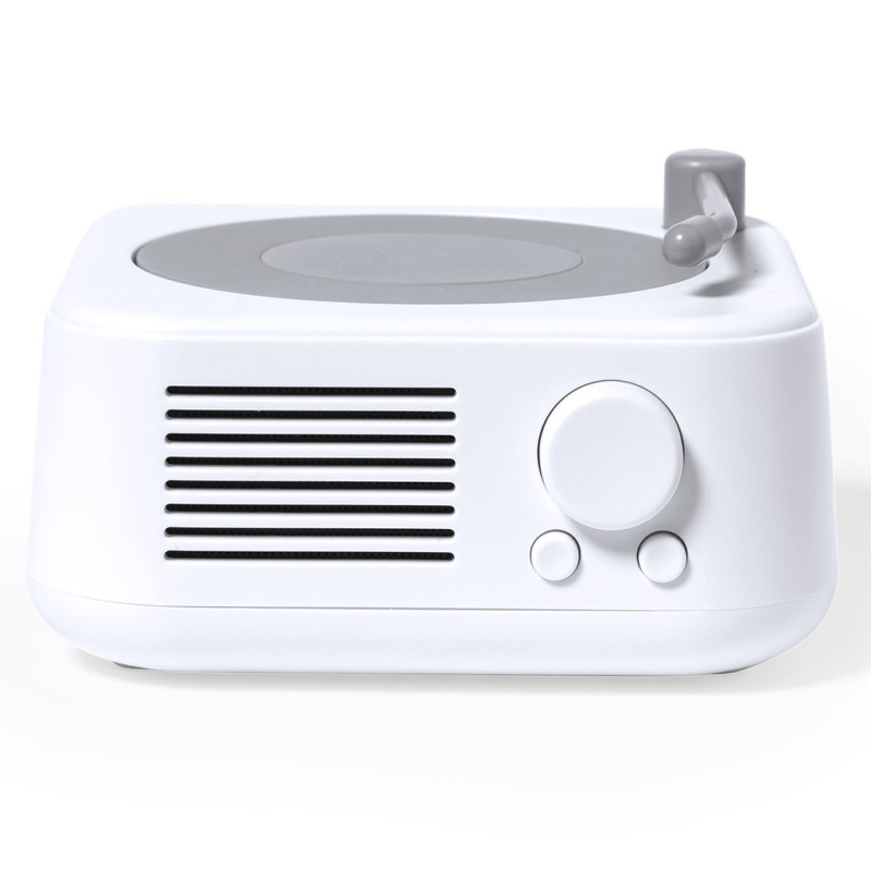 Altifalante Bluetooth® em formato original de gira-discos, tamanho compacto e 5W de potência. Bateria de lítio de 800mAh, com cabo de carregamento Tipo C incluído e luz indicadora de status de carregamento. Função mãos livres e rádio FM, com ranhura para cartões micro SD com capacidade de até 32 GB e entrada auxiliar para conector jack de 3,5 mm. Fabricado em resistente ABS branco com detalhes cinza e apresentado em caixa individual de design kraft, com manual de instruções em espanhol e inglês.