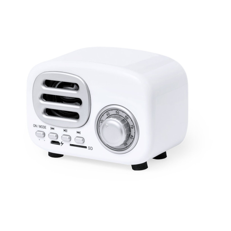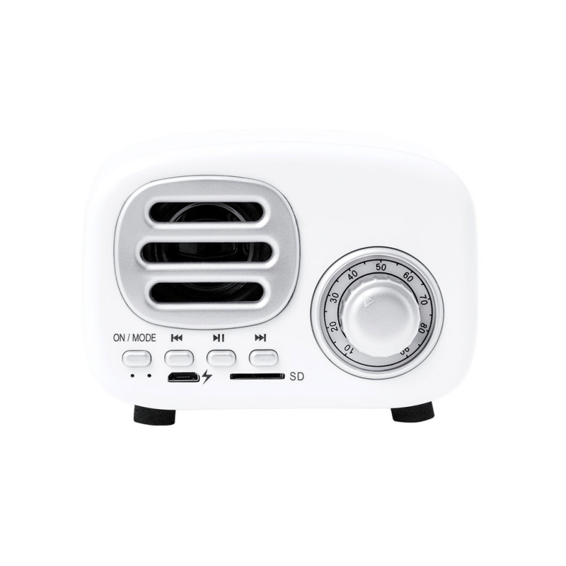 Compacto altifalante com estilo vintage com a forma de um rádio antigo e 3 W de potência.Com ligação Bluetooth® para disfrutar da liberdade sem fios, reproduzindo a música e tendo estilo ao mesmo tempo.Com luzes indicadoras, ranhura para cartão Micro SD até 64 GB e bateria de 500 mAh .Apresentado numa atrativa caixa de design kraft, com manual de instruções em espanhol e inglês.