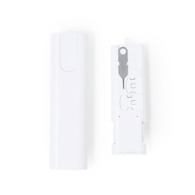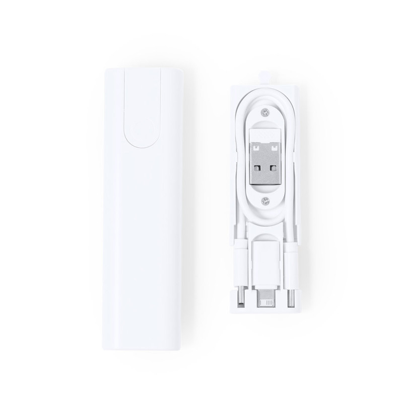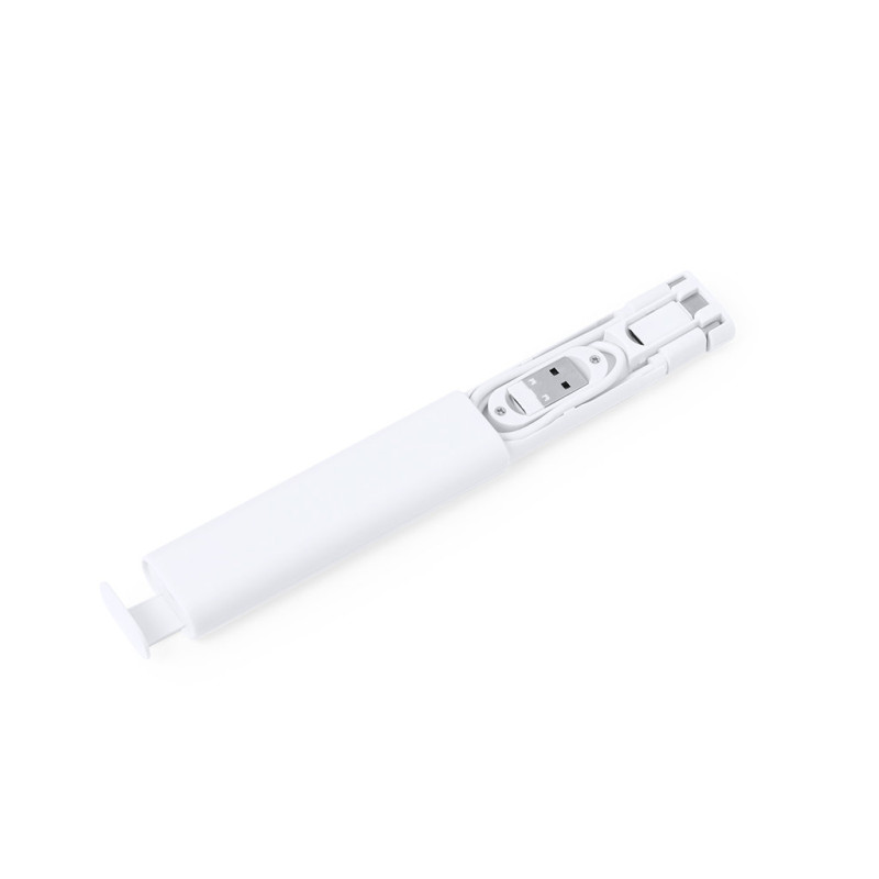 Completo set de cabos de carregador fabricados em resistente ABS. Apresentado num estojo compacto em resistente ABS de cor branca, com suporte para smartphone integrado. Inclui cabo carregador e de sincronização, adequado para transferência de dados e múltiplas ligações: Micro USB, Tipo C e Lightning; ejetor SIM incluído. 5V DC 3A. Apresentado numa caixa de design kraft.