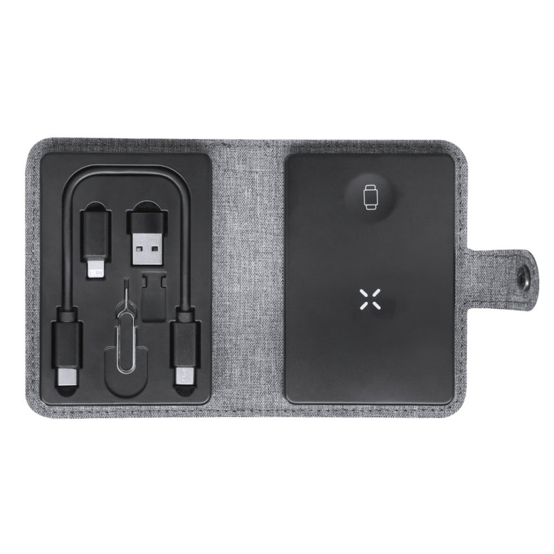 Base de carregamento completa feita de 300D RPET. Estojo compacto com fecho de botão e incluindo dock de carregamento sem fio Qi para smartphones, fones de ouvido e smartwatches. Fornecido com cabo de conexão Type-C em ambas as extremidades, além de adaptadores USB e lightning/micro USB. O conjunto é completado por um ejetor de cartão SIM e um compartimento para armazenar um cartão Micro SIM. Com logotipo RPET.O material RPET é feito de plástico reciclado, promovendo assim a reutilização de resíduos plásticos e ajudando na sustentabilidade do planeta.
