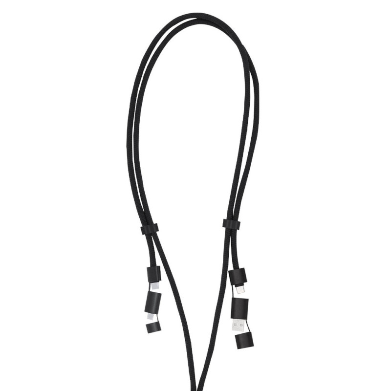 Cordão inovador com função de suporte e cabo carregador, feito de uma combinação de poliéster RPET e alumínio reciclado. Concebido para ser facilmente colocado entre a caixa e o smartphone graças ao seu acessório de transporte. Inclui cinto a condizer, mosquetão de metal giratório preto e acessório de segurança no pescoço. Oferece capacidades de carregamento e transferência de dados, com entradas USB e Type-C, e saídas Micro USB, Lightning e Type-C. Possui um emblema RPET no rótulo kraft, destacando o seu compromisso com a sustentabilidade. O material RPET é feito de plástico reciclado, promovendo assim a reutilização de resíduos plásticos e contribuindo para a sustentabilidade do planeta. O alumínio reciclado é um material com possibilidades quase infinitas de reciclagem, sem perder as suas propriedades originais e consumindo menos energia neste processo. Certificação GRS (Global Recycled Standard), que garante a origem reciclada do material utilizado para produzir o produto.