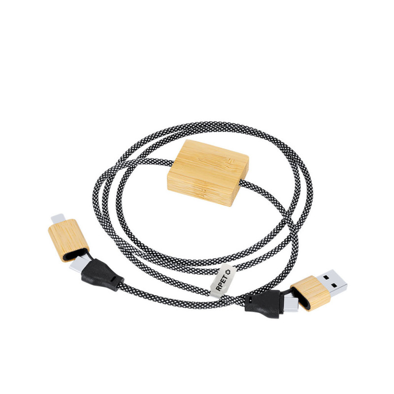 Cabo carregador de 60 W em uma combinação de RPET e bambu. Com conexões de entrada Tipo C e USB e conexões de saída Lightning, Micro USB e Tipo C. Potência de carga: Até 60W, assegurando uma carga rápida e eficiente.