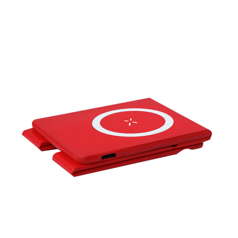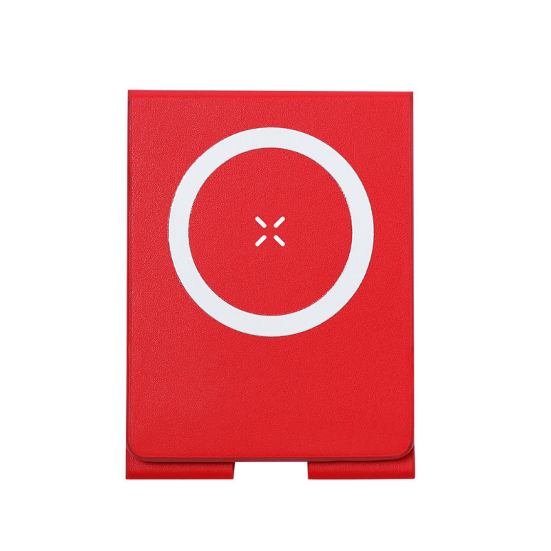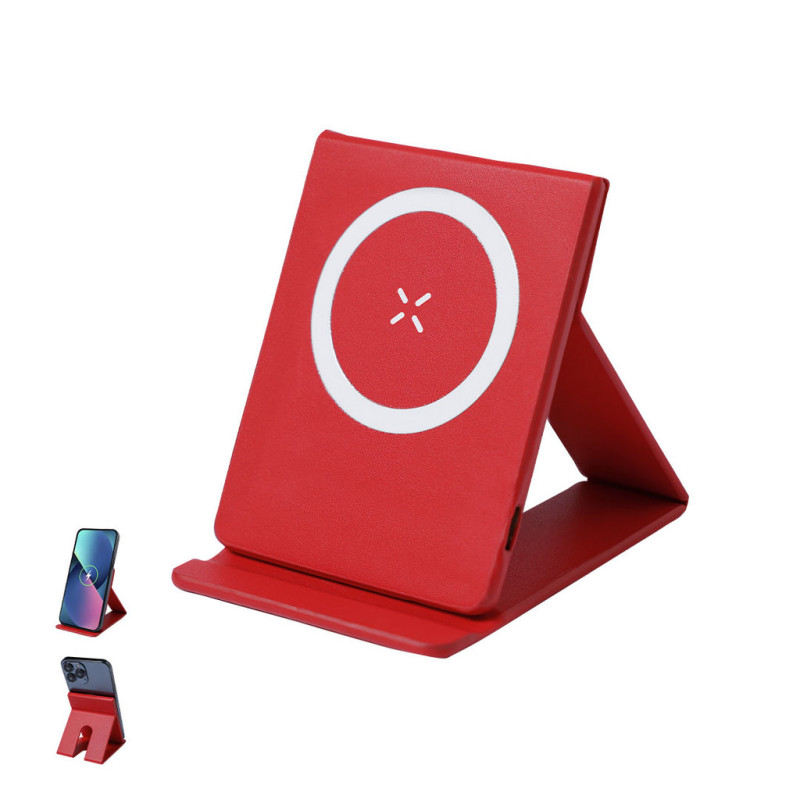 Carregador sem fio magnético de 15W, fabricado em PU. Inclui suporte dobrável, com possibilidade de várias posições do smartphone, e indicador de estado de carga. Compatível com dispositivos equipados com tecnologia de carregamento sem fio. Inclui cabo de carregamento USB de 1m, com conector de entrada Tipo C, e anel metálico com adesivo. Manual de instruções disponível em espanhol e inglês.