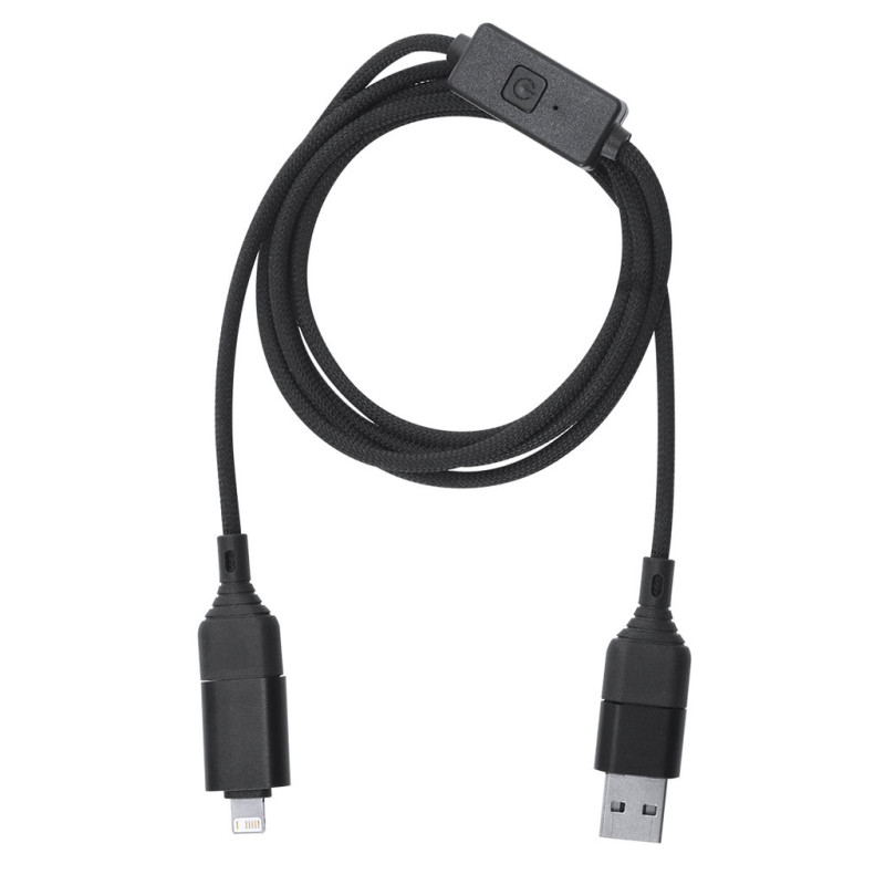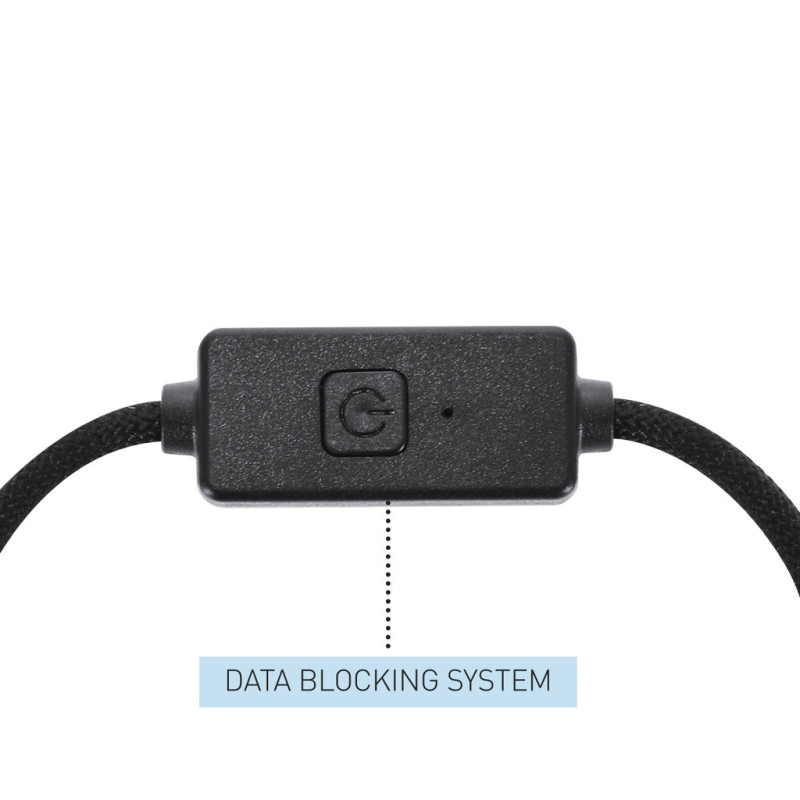Cabo de carregamento de 60W e transferência de dados, com sistema de proteção de dados. Fabricado em alumínio reciclado combinado com RPET e ABS reciclado. Inclui botão de segurança integrado que permite desativar a função de transferência de dados — uma solução prática para proteger informações pessoais e confidenciais quando o cabo é utilizado em espaços públicos, evitando acessos não autorizados ou tentativas de pirataria. Conexões de entrada: Tipo C e USB; conexões de saída: Tipo C e Lightning. O Alumínio Reciclado é um material com possibilidades de reciclagem quase infinitas, sem perder as suas propriedades originais e consumindo menos energia neste processo. O material RPET é produzido a partir de plástico reciclado, promovendo a reutilização de resíduos plásticos e contribuindo para a sustentabilidade do planeta.