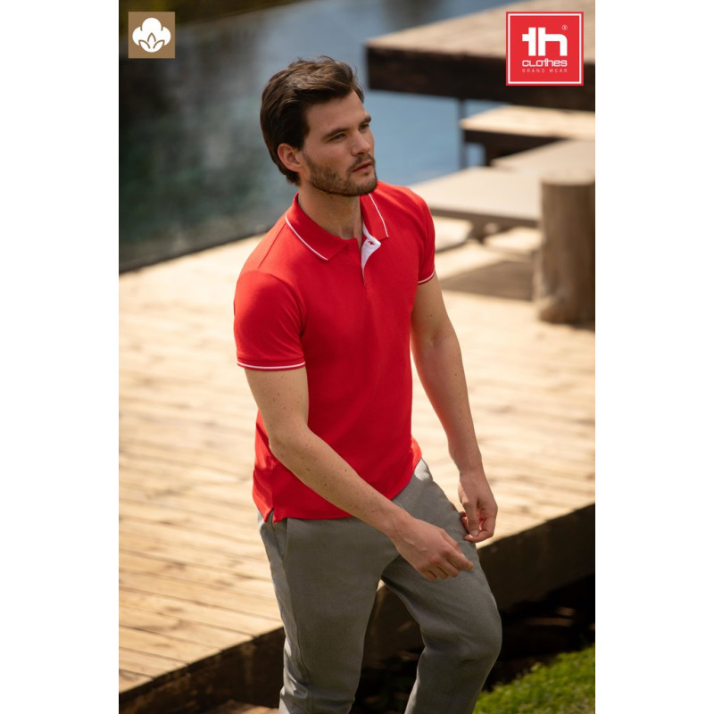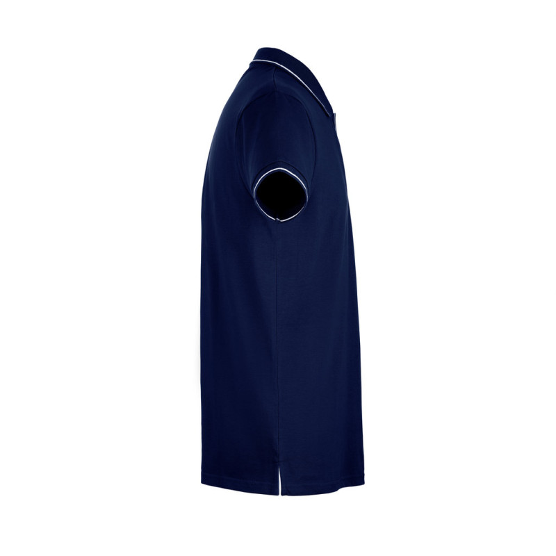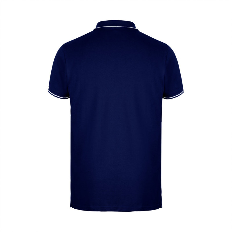 Gola e acabamento das mangas em rib 1x1 • Contraste bicolor na gola, fita de reforço, carcela e mangas • Manga curta • Carcela reforçada com 2 botões à cor e um botão extra na costura lateral interior • Parte inferior com aberturas laterais com cor contrastante