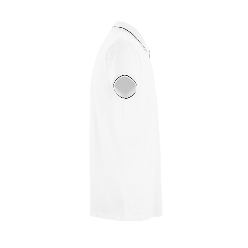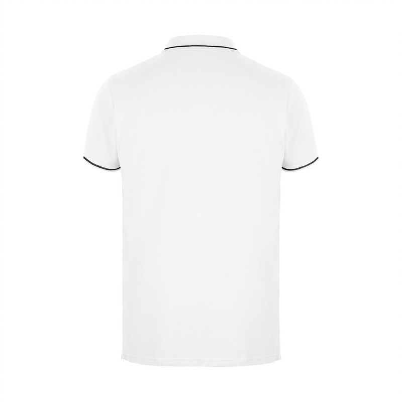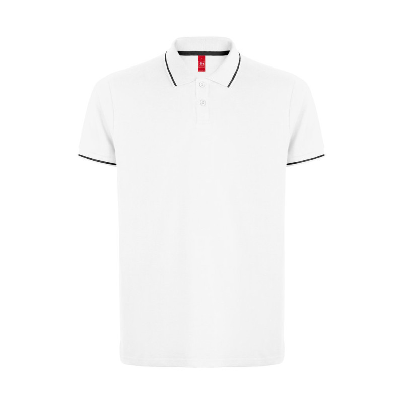 Gola e acabamento das mangas em rib 1x1 • Contraste bicolor na gola, fita de reforço, carcela e mangas • Manga curta • Carcela reforçada com 2 botões à cor e um botão extra na costura lateral interior • Parte inferior com aberturas laterais com cor contrastante