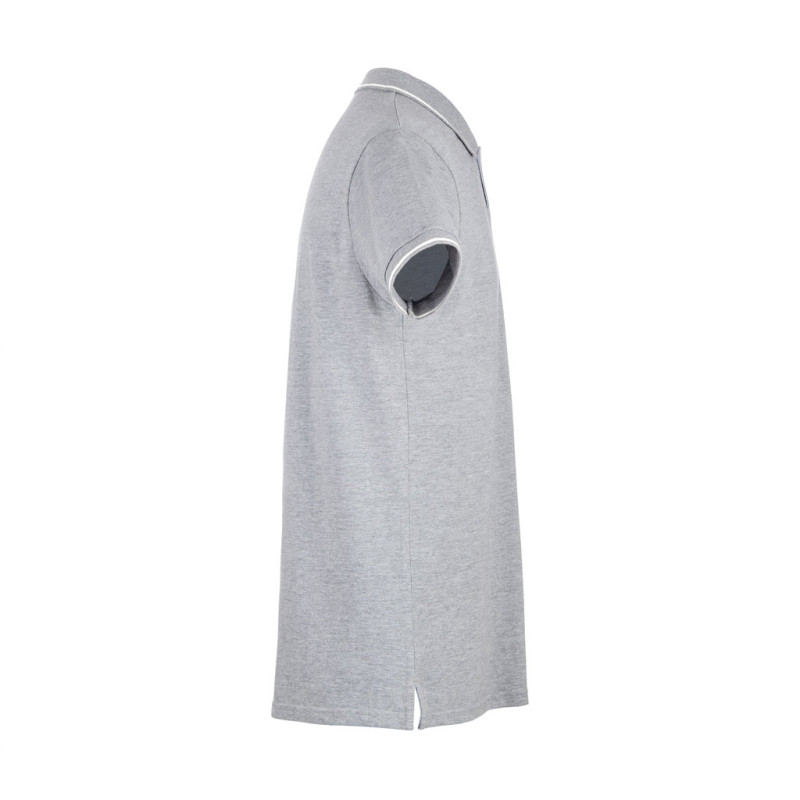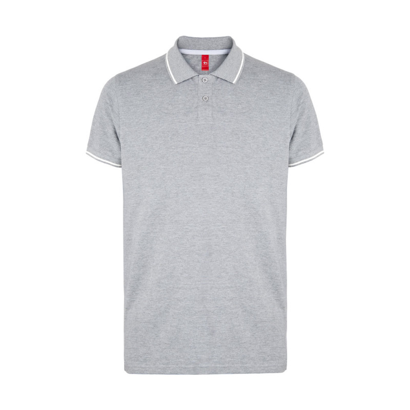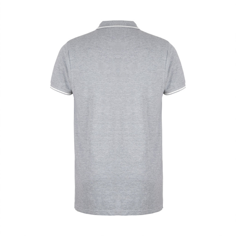 Gola e acabamento das mangas em rib 1x1 • Contraste bicolor na gola, fita de reforço, carcela e mangas • Manga curta • Carcela reforçada com 2 botões à cor e um botão extra na costura lateral interior • Parte inferior com aberturas laterais com cor contrastante