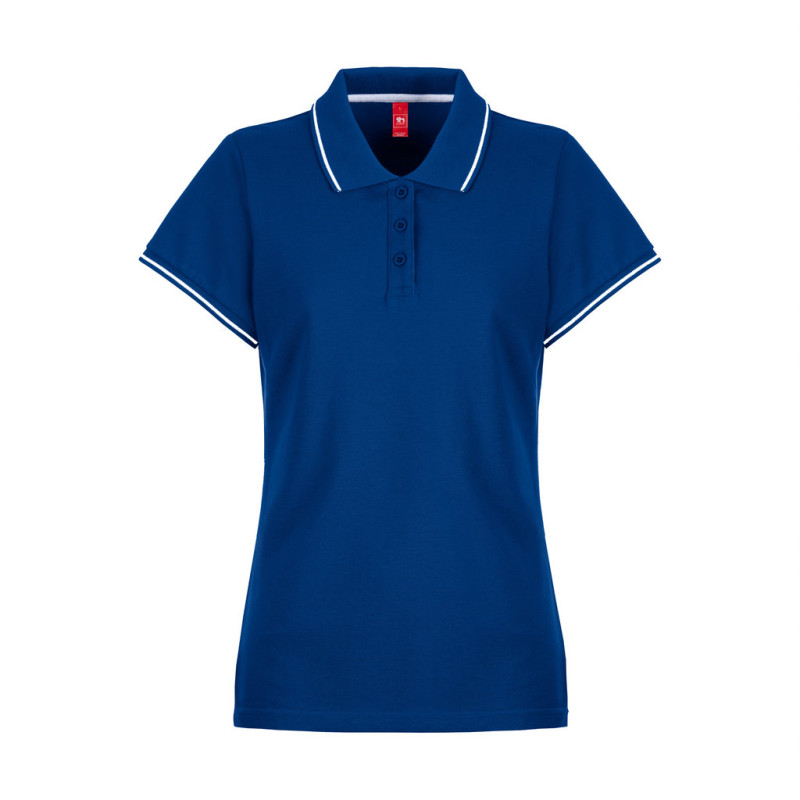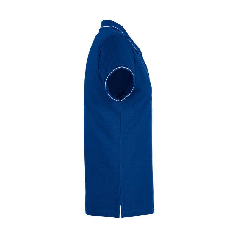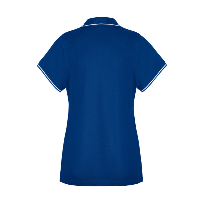 Gola e acabamento das mangas em rib 1x1 • Contraste bicolor na gola, fita de reforço, carcela e mangas • Manga curta • Carcela reforçada com 3 botões à cor e um botão extra na costura lateral interior • Parte inferior com aberturas laterais com cor contrastante • Cintado