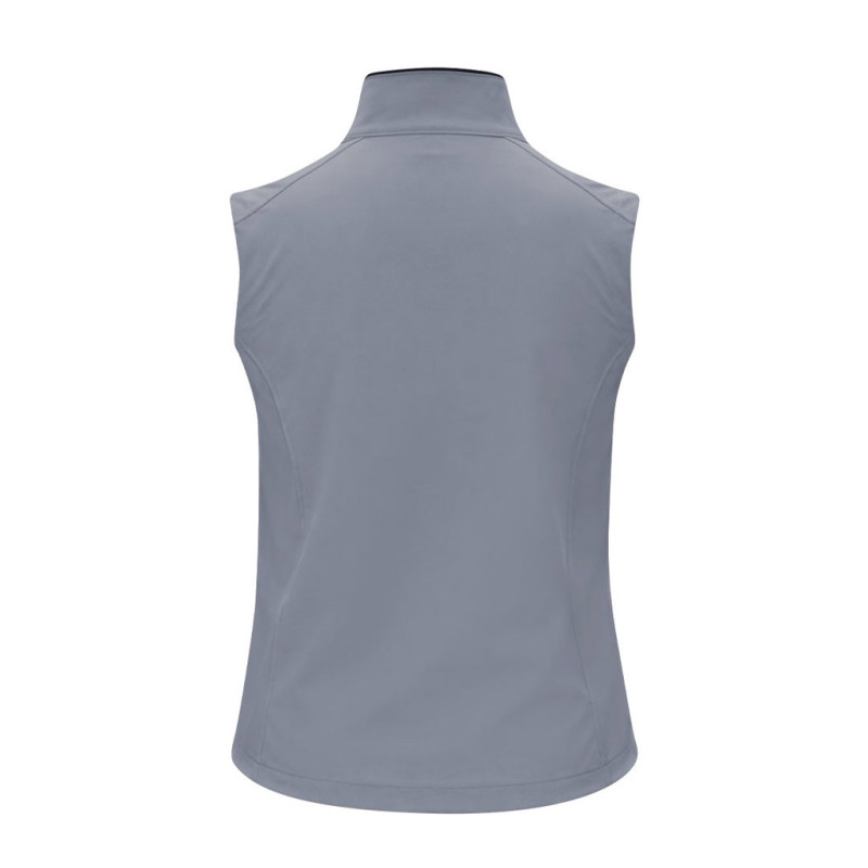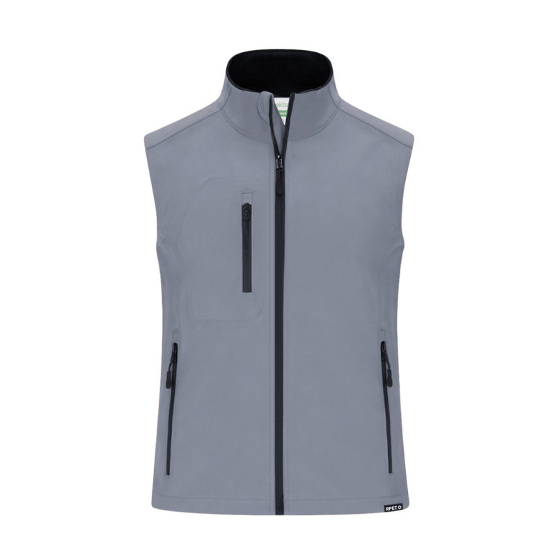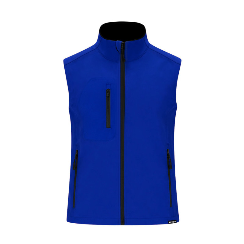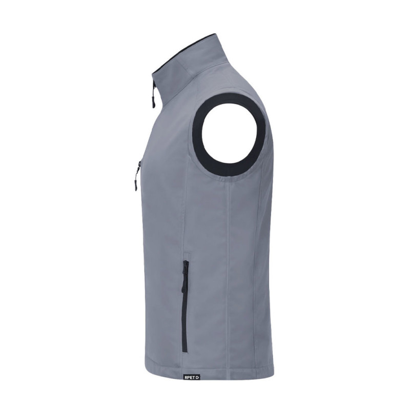 Colete RPET Soft Shell feito em 3 camadas, 340 g/m². Com membrana de 8000mm, à prova d'água e respirável. Exterior em Soft Shell e interior em microfleece polar preto. Com bolso externo no peito direito e dois bolsos laterais com zíperes. Com fecho central e zíperes invertidos nos bolsos, incluindo puxadores pretos com cordão. Protetor de queixo combinando e cintura ajustável, com banda elástica e stopper. Etiqueta RPET na barra da peça.