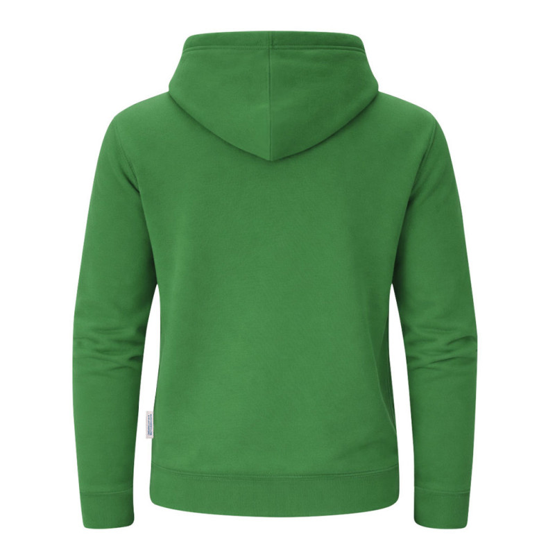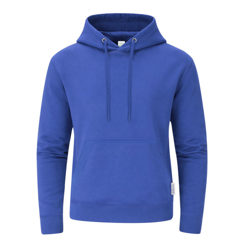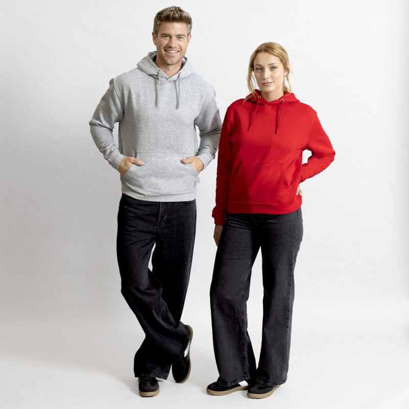 Moletom com capuz unissex em algodão orgânico e poliéster reciclado, em fleece macio de 280g/m². Com capuz de duas camadas forrado, cordões redondos ajustáveis - com terminais combinando - e ilhós metálicos. Punhos e barra em malha de rib elastano, e bolso canguru na frente. Costura reforçada na gola, com etiqueta ecológica distintiva.