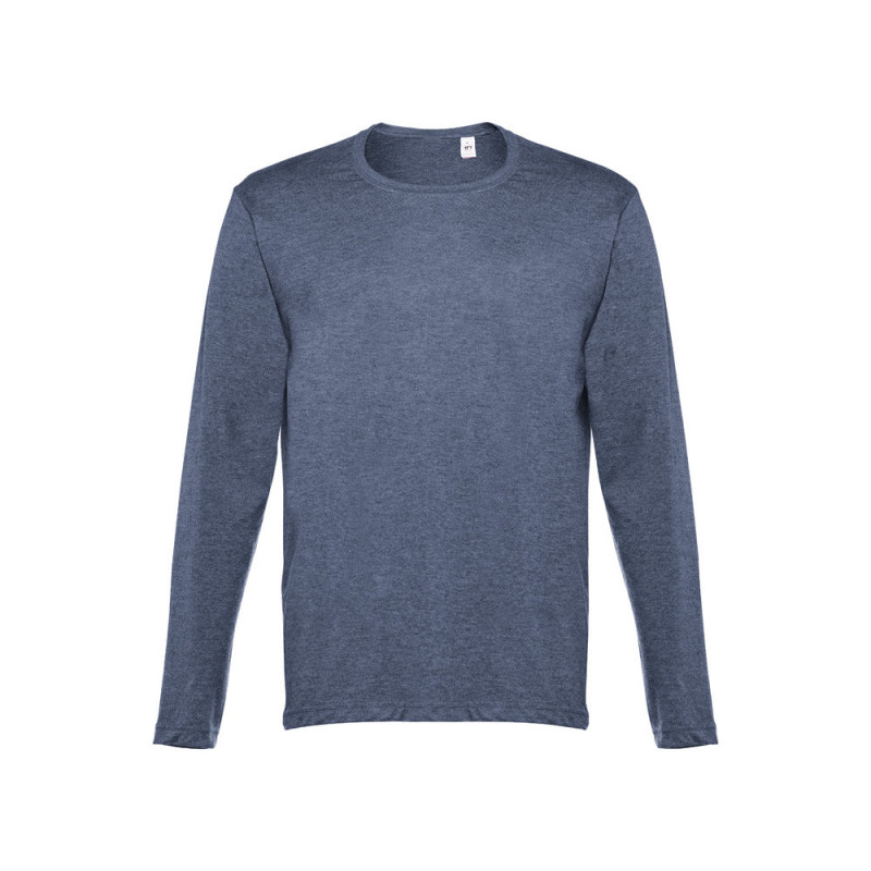 T-shirt de manga comprida para homem em malha jersey 100% algodão (150 g/m²) com fio de algodão cardado (cores: 195: 60% algodão/40% poliéster, cor 183: 90% algodão/10% viscose). Gola em Rib 1x1 e fita de reforço em jersey. T-shirt tubular com corte regular e costura dupla nas mangas e parte inferior. Tamanhos: S, M, L, XL, XXL