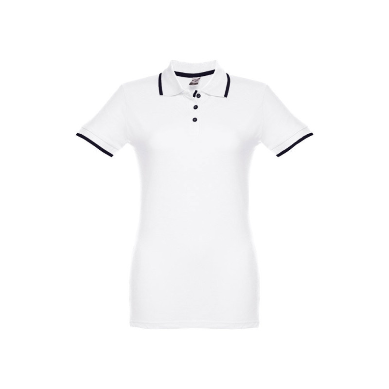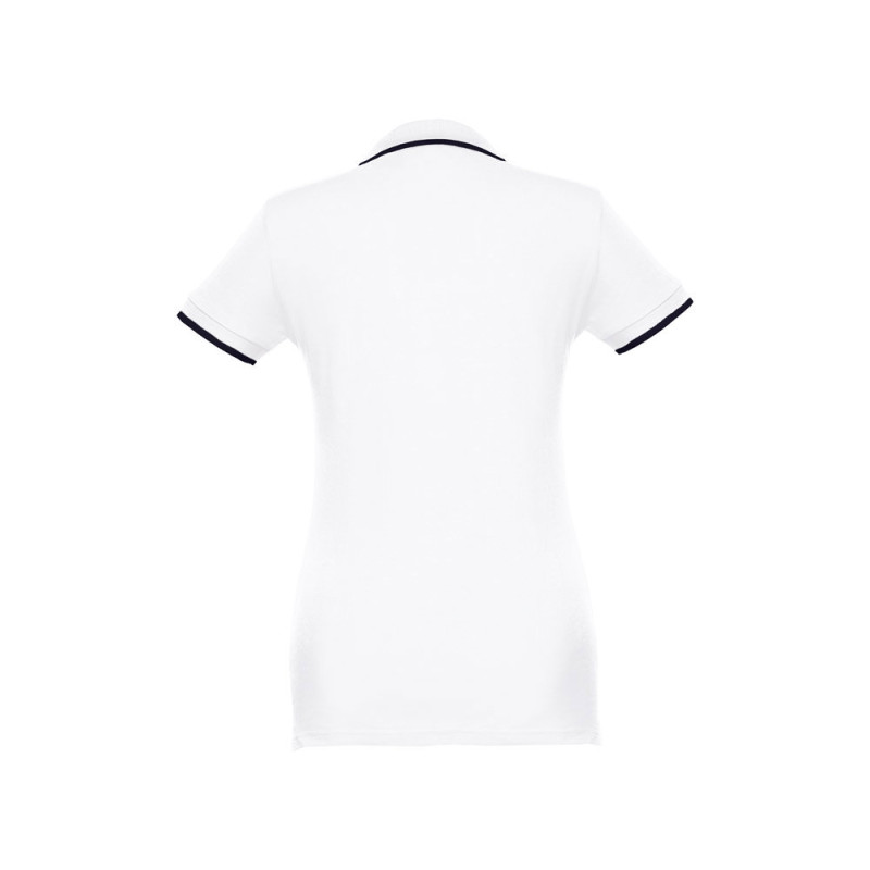 Polo bicolor de manga curta para mulher em malha piqué 100% algodão cardado (210 g/m²). Contraste bicolor na gola, manga e carcela. Contém gola e mangas em Rib. Carcela reforçada com 3 botões à cor contrastante (botão suplente inserido na costura interior). Peça com corte cintado com pequenas aberturas laterais na parte inferior do polo. Tamanhos: S, M, L, XL, XXL
