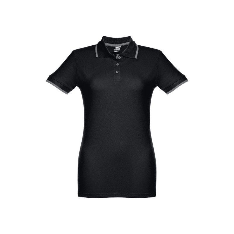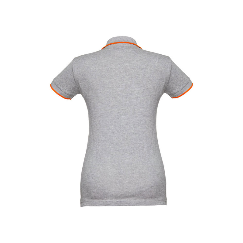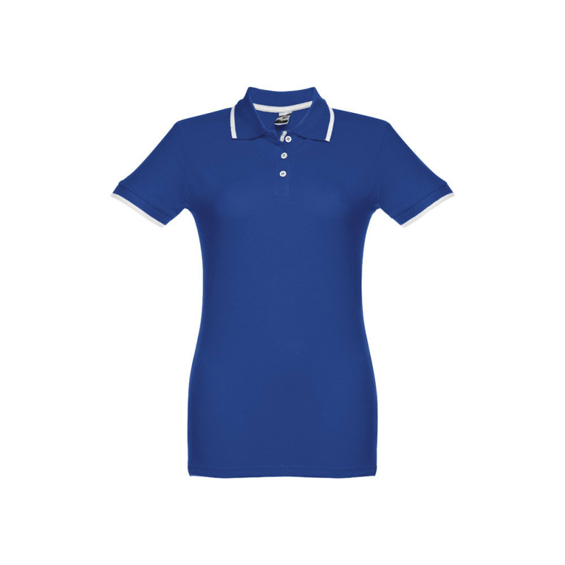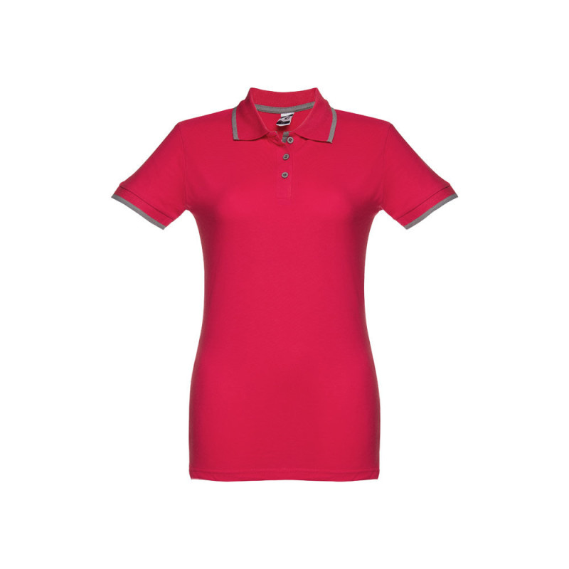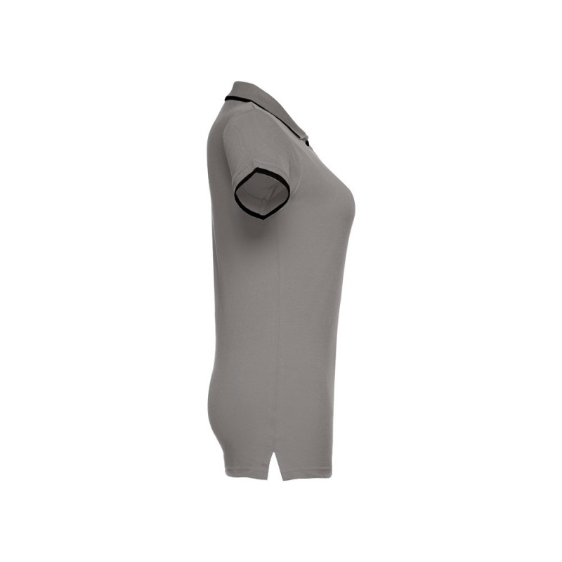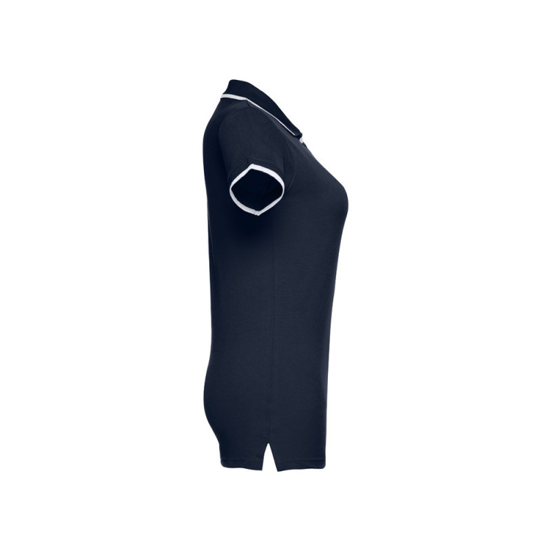 Polo bicolor de manga curta para mulher em malha piqué 100% algodão cardado (210 g/m²) (cor: 183: 85% algodão/15% viscose). Contraste bicolor na gola, manga e carcela. Contém gola e mangas em Rib. Carcela reforçada com 3 botões à cor contrastante (botão suplente inserido na costura interior). Peça com corte cintado com pequenas aberturas laterais na parte inferior do polo. Tamanhos: S, M, L, XL, XXL