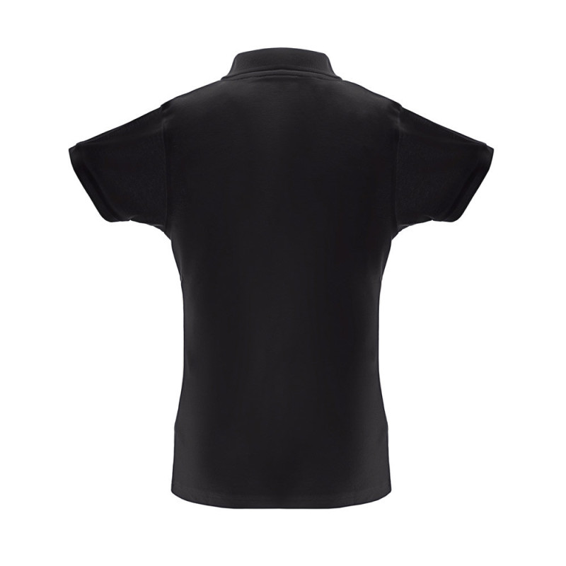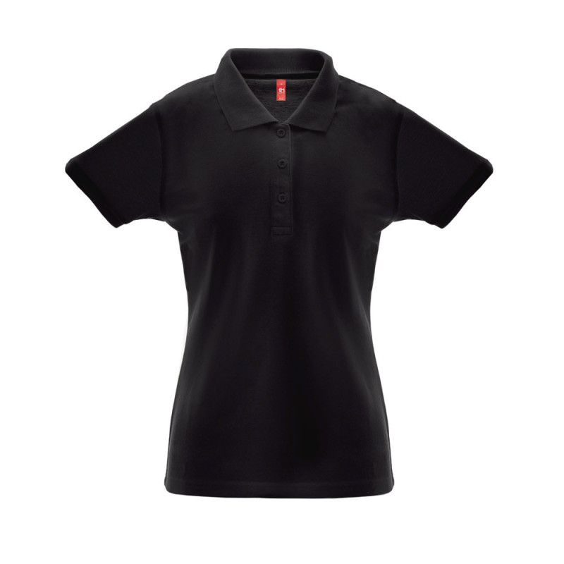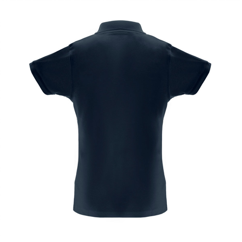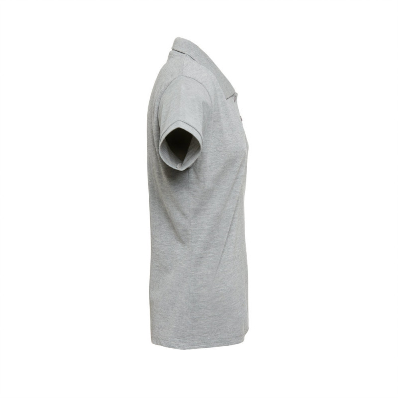Polo de manga curta para mulher em malha piqué 35% algodão cardado e 65% poliéster (200 g/m²) (cor: 183: 85% algodão/15% viscose). Polo de corte cintado com gola e mangas em Rib, sendo a gola reforçada com fita em malha piqué. Contém carcela reforçada com 3 botões à cor (botão suplente inserido na costura interior). Peça cortada e cosida. Tamanhos: S, M, L, XL, XXL