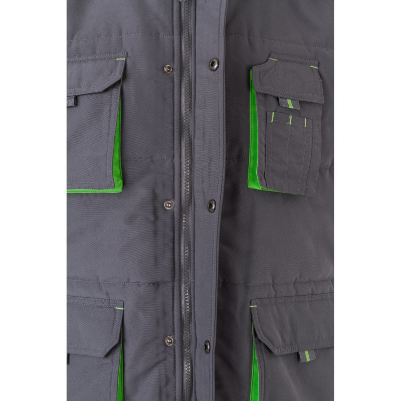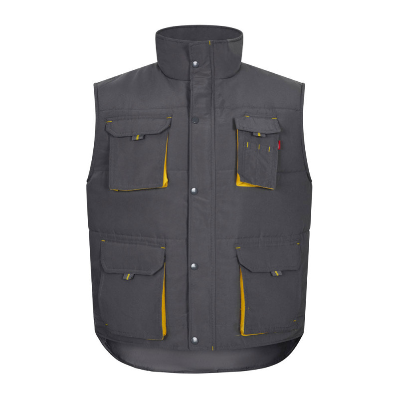 Colete acolchoado, bicolor multibolsos (120g/m²), em poliéster (100%). Fecho de correr, oculto com carcela de botões. Cós lateral elástico, corta-vento na cava. Com foles, puxadores e pespontos em cor contraste. Contém oito bolsos (2 bolsos fole no peito, 2 bolsos fole inferiores, 2 bolsos laterais, 1 bolso fole no peito e 1 bolso interior). Tamanho: S, M, L, XL, 2XL, 3XL
