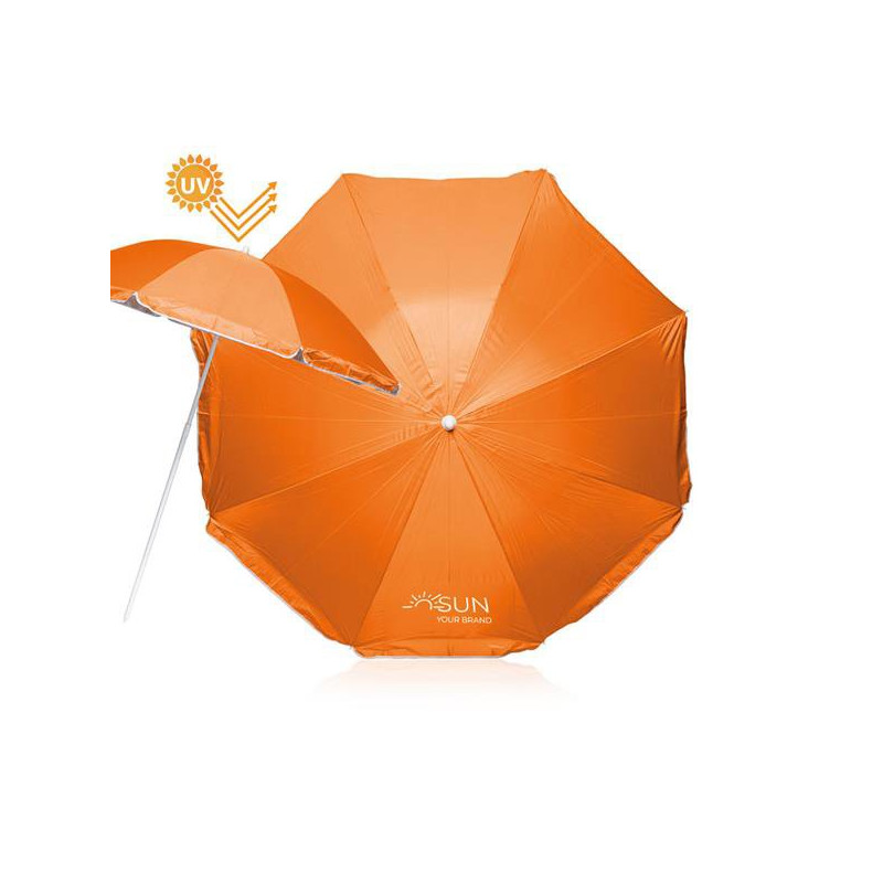 Guarda-sol com proteção UV. Proteja-se a si e à sua família do sol quando vai até à praia. Com este chapéu de 180cm de diâmetro com proteção UV, ir à praia ficou ainda mais seguro. De fácil transporte graças à sua bolsa a combinar com o material do chapéu. Ótima área para personalizar.