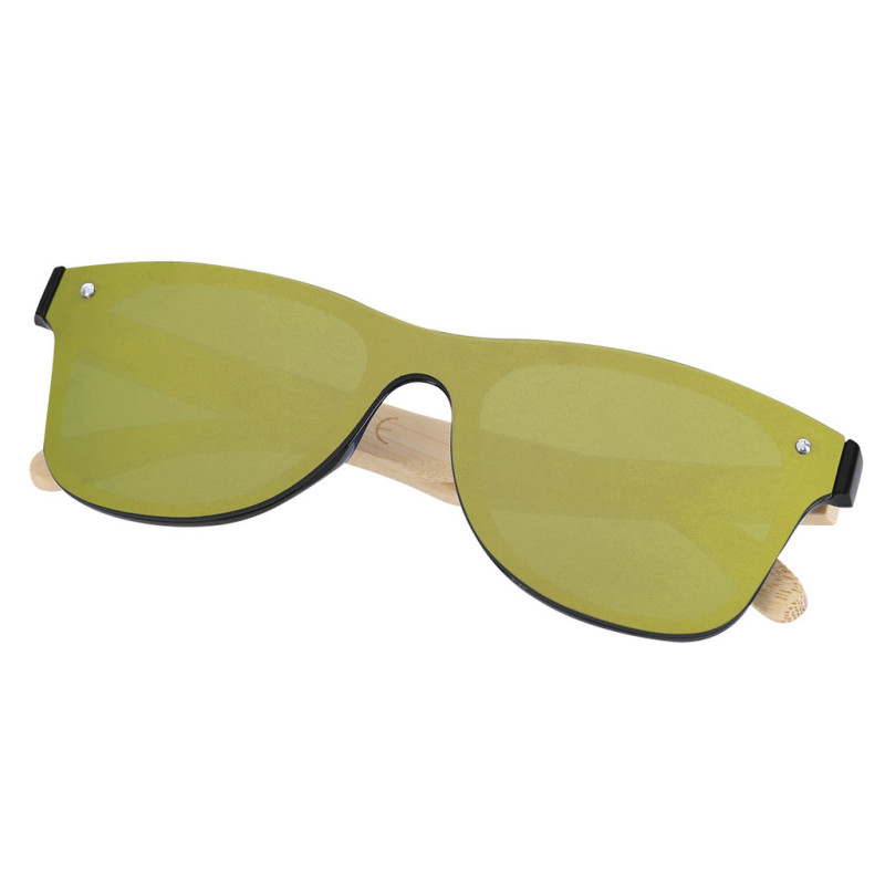 Óculos de sol de linha nature com proteção UV400. Estrutura negra em resistente material PC, com lentes efeito espelho e hastes fabricadas em bambú natural. Apresentados em atrativo estojo de design eco.