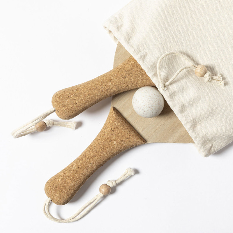 Par de raquetes de praia de linha nature. Fabricadas em madeira, com pega reforçada em cortiça natural e cintas para o pulso com ajustador. Apresentadas em bolsa de algodão natural com fecho de cordão e bola em palha de trigo.