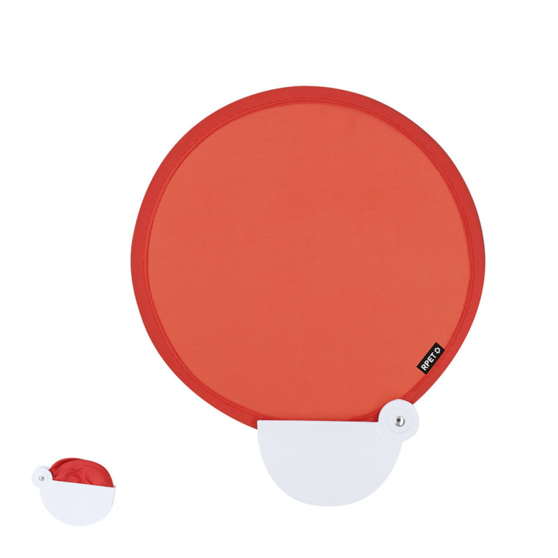 Leque dobrável em RPET. Fácil de transportar graças ao sistema de dobragem, inclui etiqueta distintiva RPET.O material RPET é feito a partir de plástico reciclado, promovendo a reutilização de resíduos plásticos e ajudando na sustentabilidade do planeta.