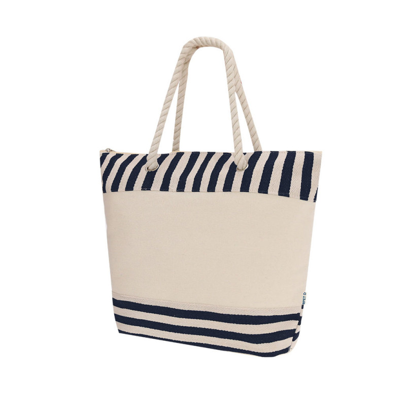 Bolsa térmica confeccionada em material RPET resistente com interior em alumínio, ideal para manter a temperatura de alimentos e bebidas.Com um design em listras naturais combinando com a cor. Inclui fechamento de zíper para maior segurança e alças longas de algodão em formato corda, reforçadas com resistentes argolas metálicas.