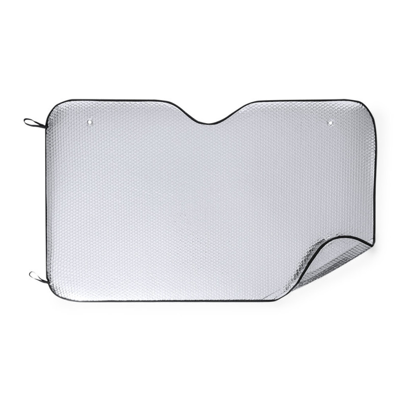 Só de sol de alumínio com bolha de ambos os lados em acabamento metálico prateado com tubulação preta. Tamanho 130x80cm, com anéis de reforço de metal, tiras elásticas para dobrar, dois copos de sucção para ajuste e apresentação se desdobraram para fácil impressão.