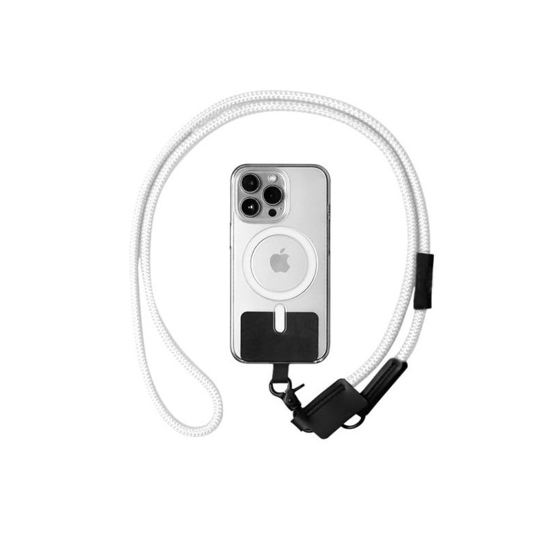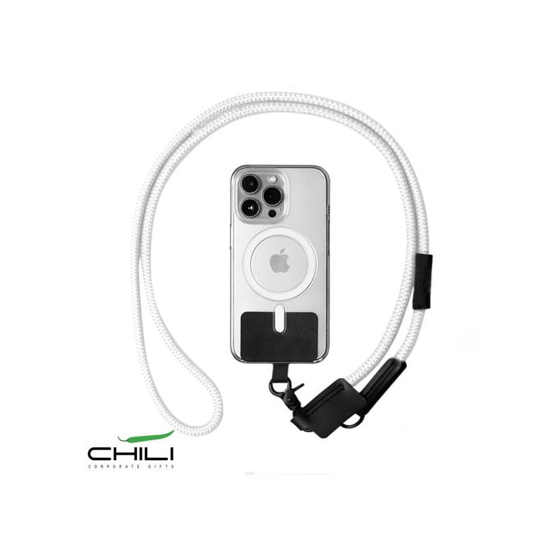 Lanyard em RPET, com suporte para telemóvel . Prática e elegante, perfeita para manter o seu smartphone sempre acessível e em total segurança. Produzida em RPET, um material reciclado e sustentável, oferece resistência, conforto e um compromisso ambiental que faz a diferença. Esta lanyard permite usar o telemóvel ao pescoço ou ao ombro, evitando quedas acidentais e deixando as mãos completamente livres — ideal para viagens, concertos, caminhadas, trabalho ou o dia a dia.O suporte fino encaixa discretamente entre a capa e o telemóvel, sem interferir no carregamento, garantindo uma utilização simples e universal. Disponível em branco e em preto e branco, combina funcionalidade com um design moderno que se adapta facilmente a qualquer estilo — tudo isto com a qualidade a que a Chii já nos habituou.