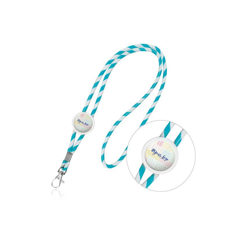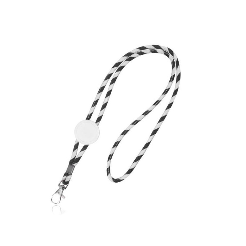 Lanyard tubular em terylene, ajustável e mosquetão. Lanyard com um padrão de riscas largas que variam em combinação entre o branco e outras cores. O ajustável em plástico foi especialmente desenhado para personalização através de resina. Adicione o seu logotipo, slogan ou design exclusivo para criar uma peça única que reflete a identidade da sua marca. Para tornar a personalização mais fácil, pode adquirir a nossa resina 370487, criada especialmente para este ajustável.