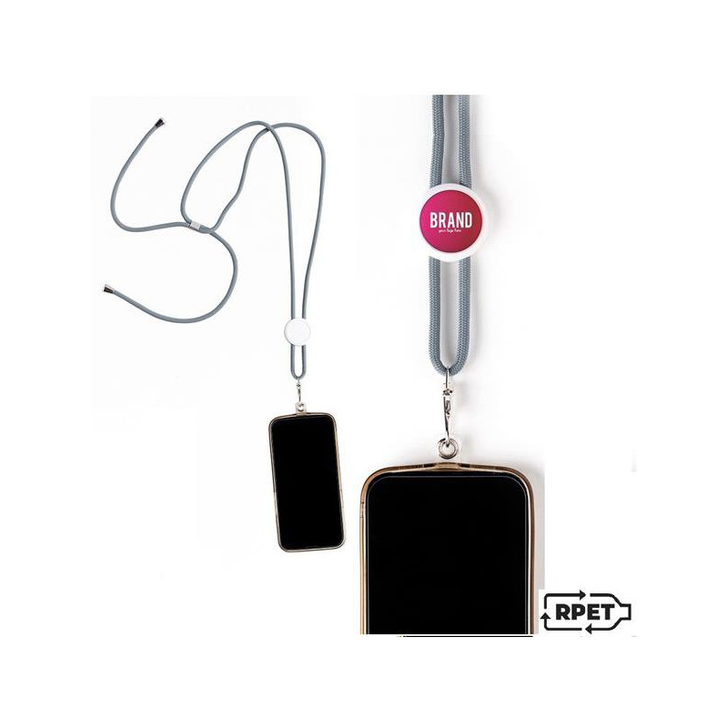 Lanyard porta-telemóvel em RPET, esta lanyard , super actual permite que tenha o seu telemóvel sempre perto de si e para que o possa atender de forma muito rápida ao mesmo tempo que o protege de quedas acidentais