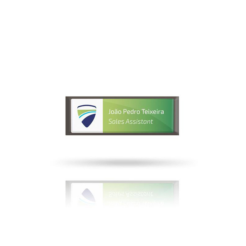 Personalize este crachá magnético antracite de forma rápida e fácil. Mantém-se em todos os tipos de tecidos com uma forte aderência sem os danificar. É perfeito para identificar o utilizador perante o público. Personalizável em 1 face com inserção de papel (64x22mm).